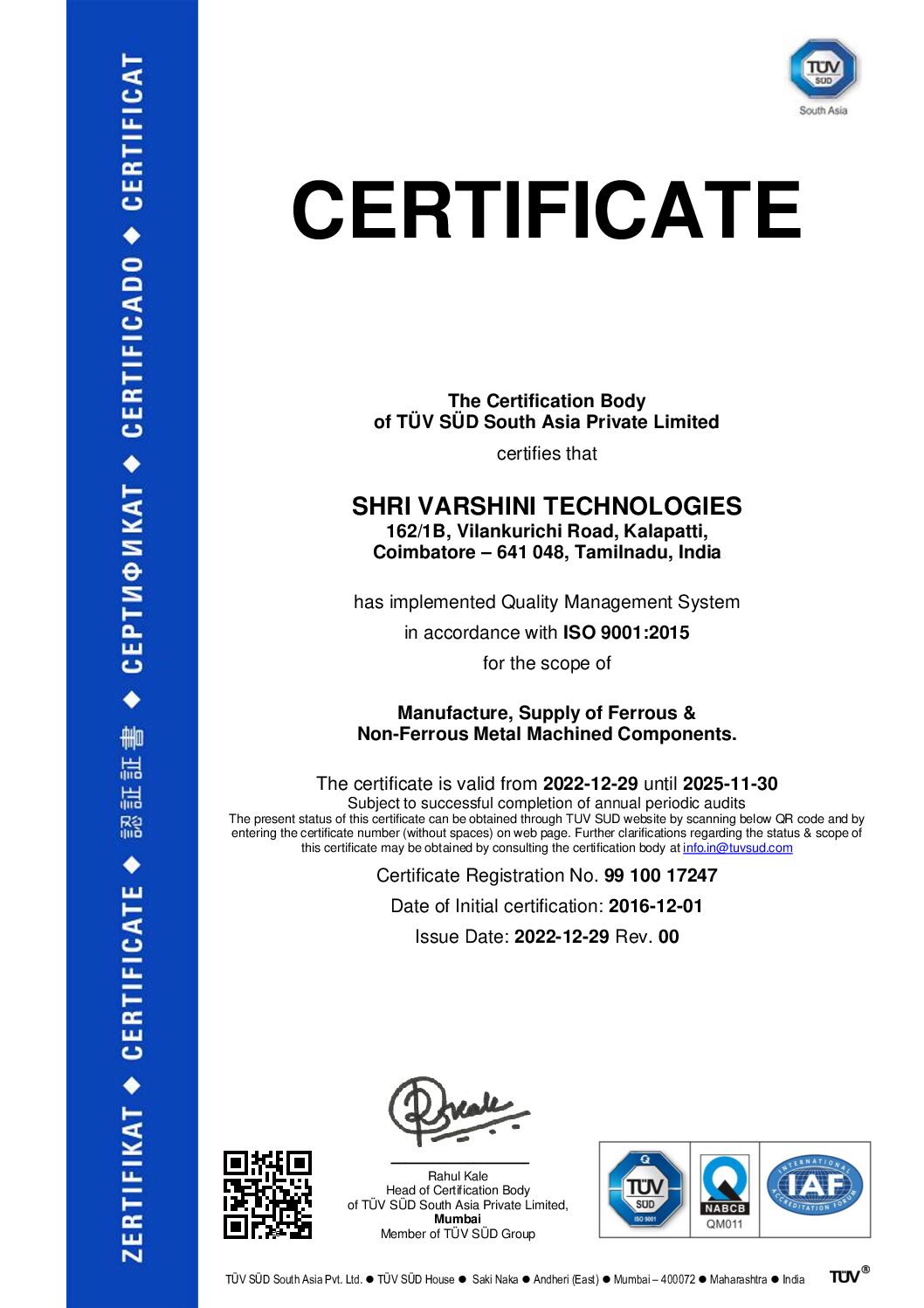 ShriVarshini Technologies is a 9001-2015 certified company engaged in the business of manufacturing and supplying of castings and machined components with our own machine shop.